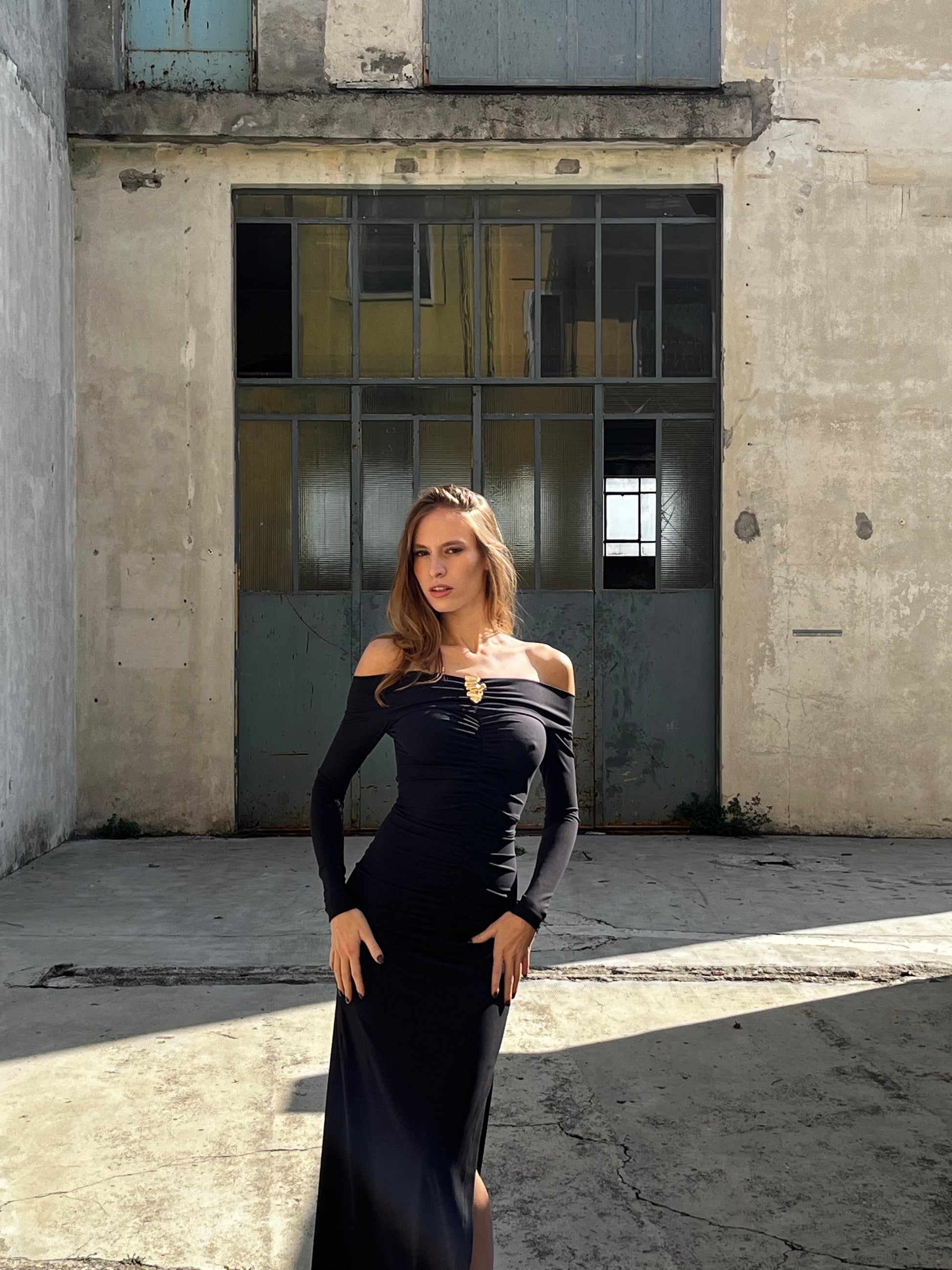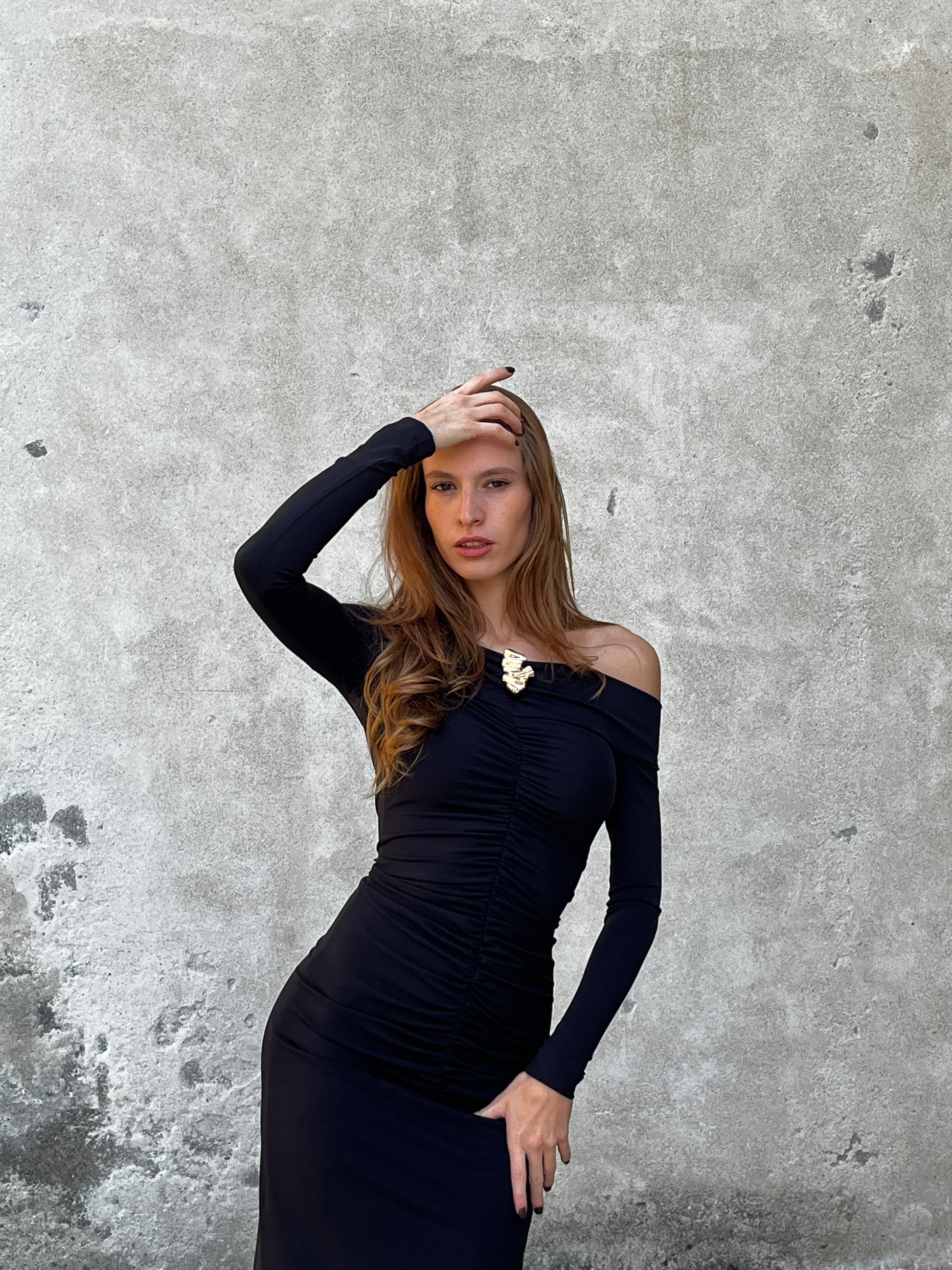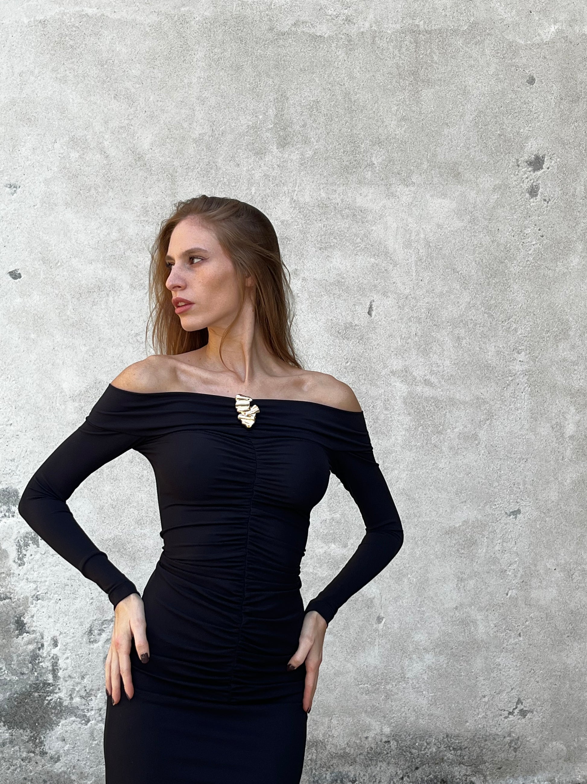 Abito elasticizzato, aderente con scollo a barchetta e drappeggio. Spacco laterale.Spilla frontale dorata.