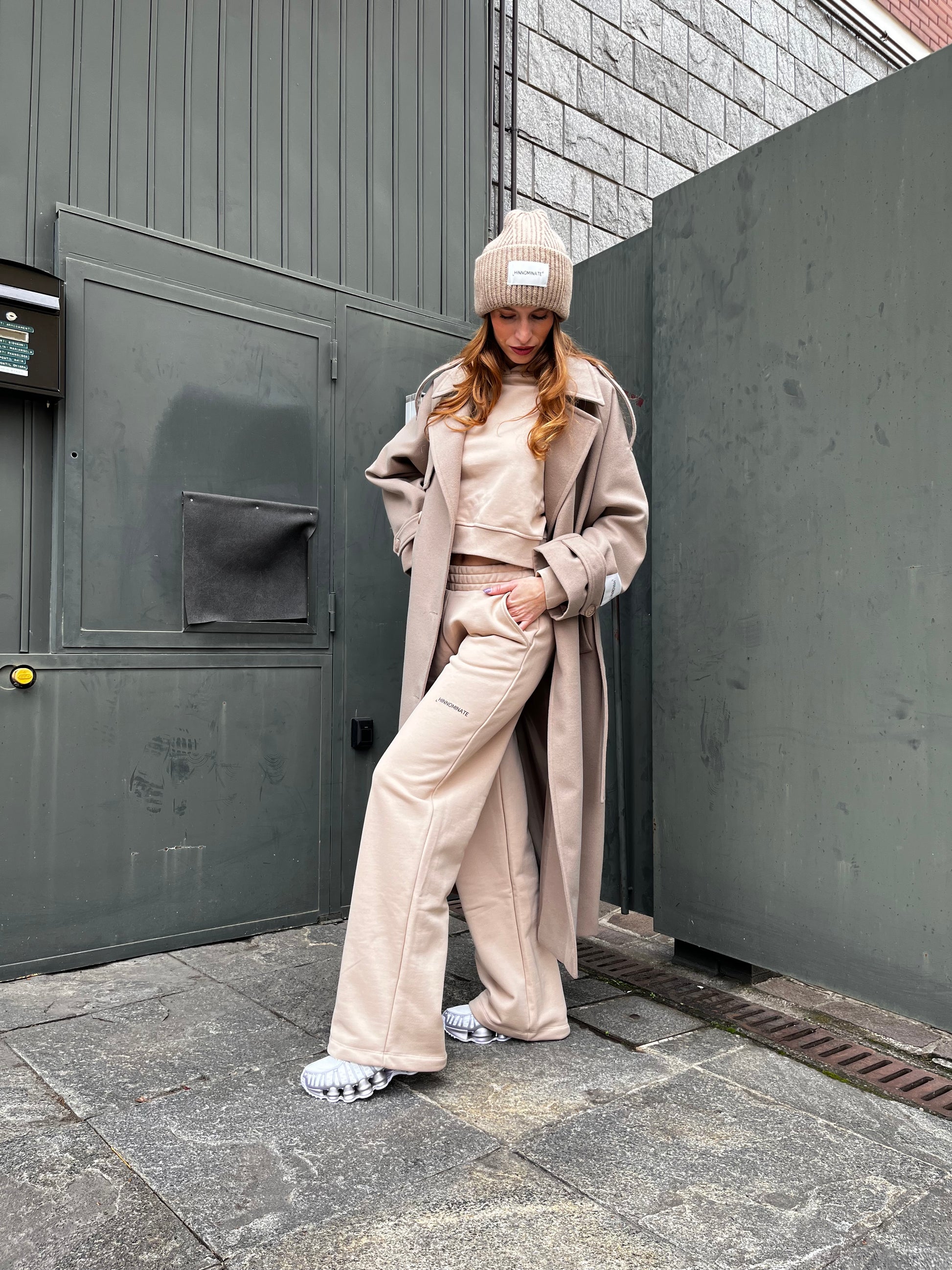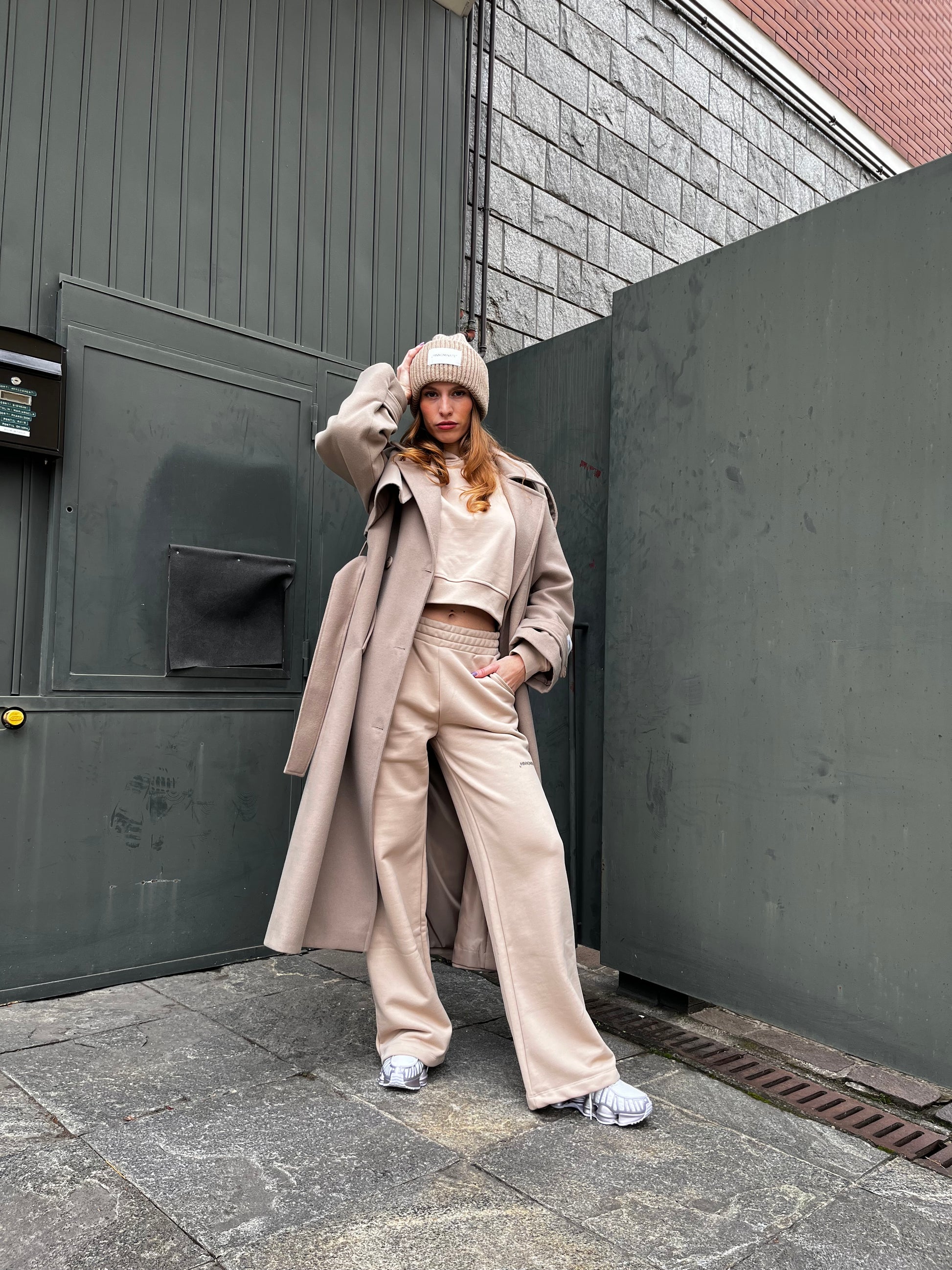 Cappotto over in panno con cintura in vita e spacco sul retro. La modella indossa una XS.