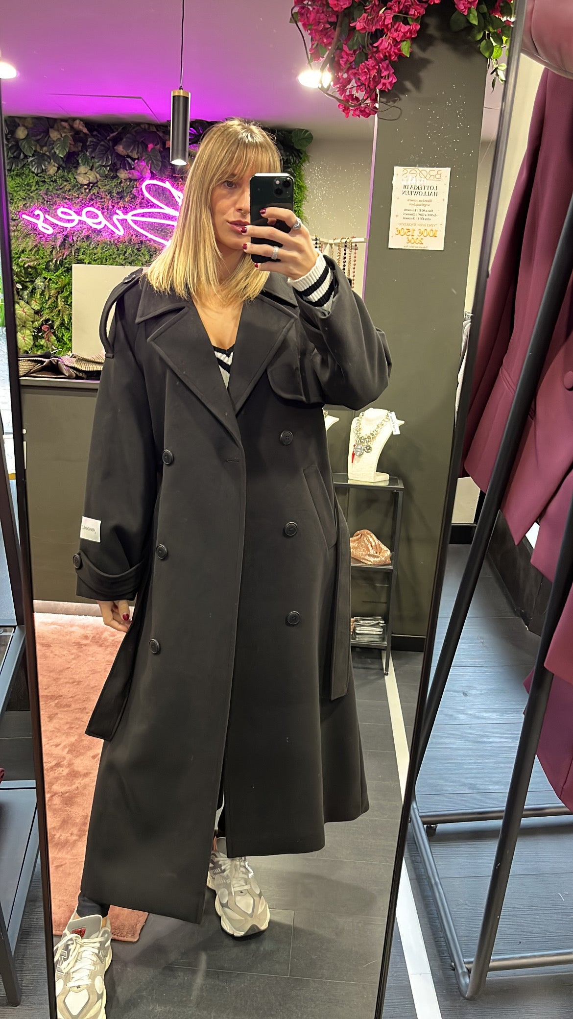 Cappotto over in panno con cintura in vita e spacco sul retro. La modella indossa una XS.