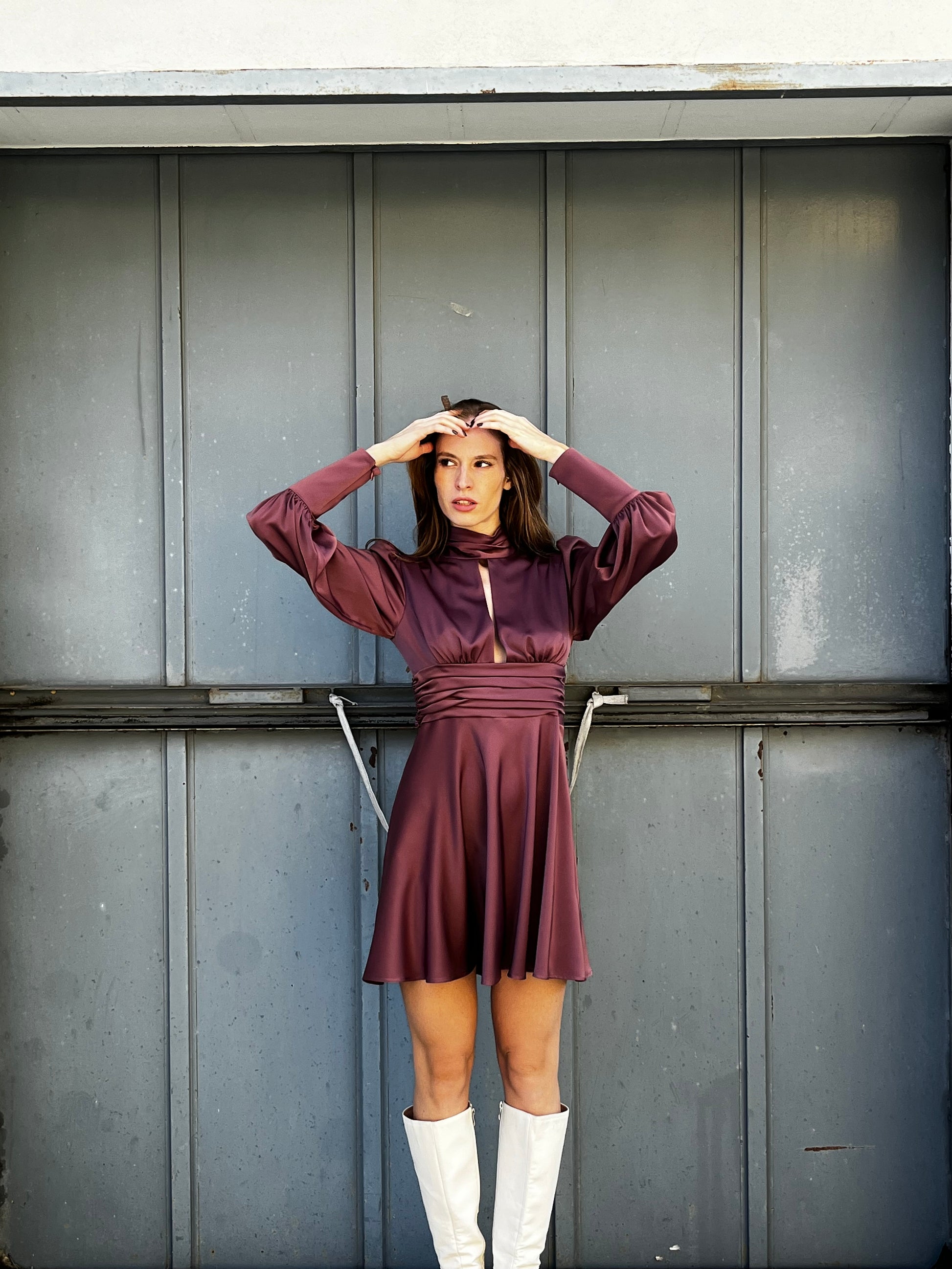 Abito Silence in raso con scollo profondo, fascia in vita e maniche a palloncino con zip sul polso.