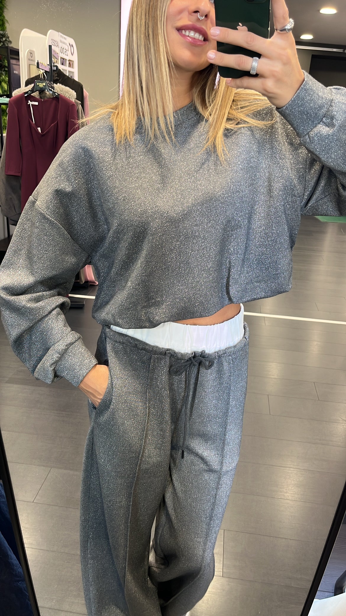 Felpa con glitter, leggermente crop a palloncino. Manica scesa. Tessuto liscio e morbido al tatto.