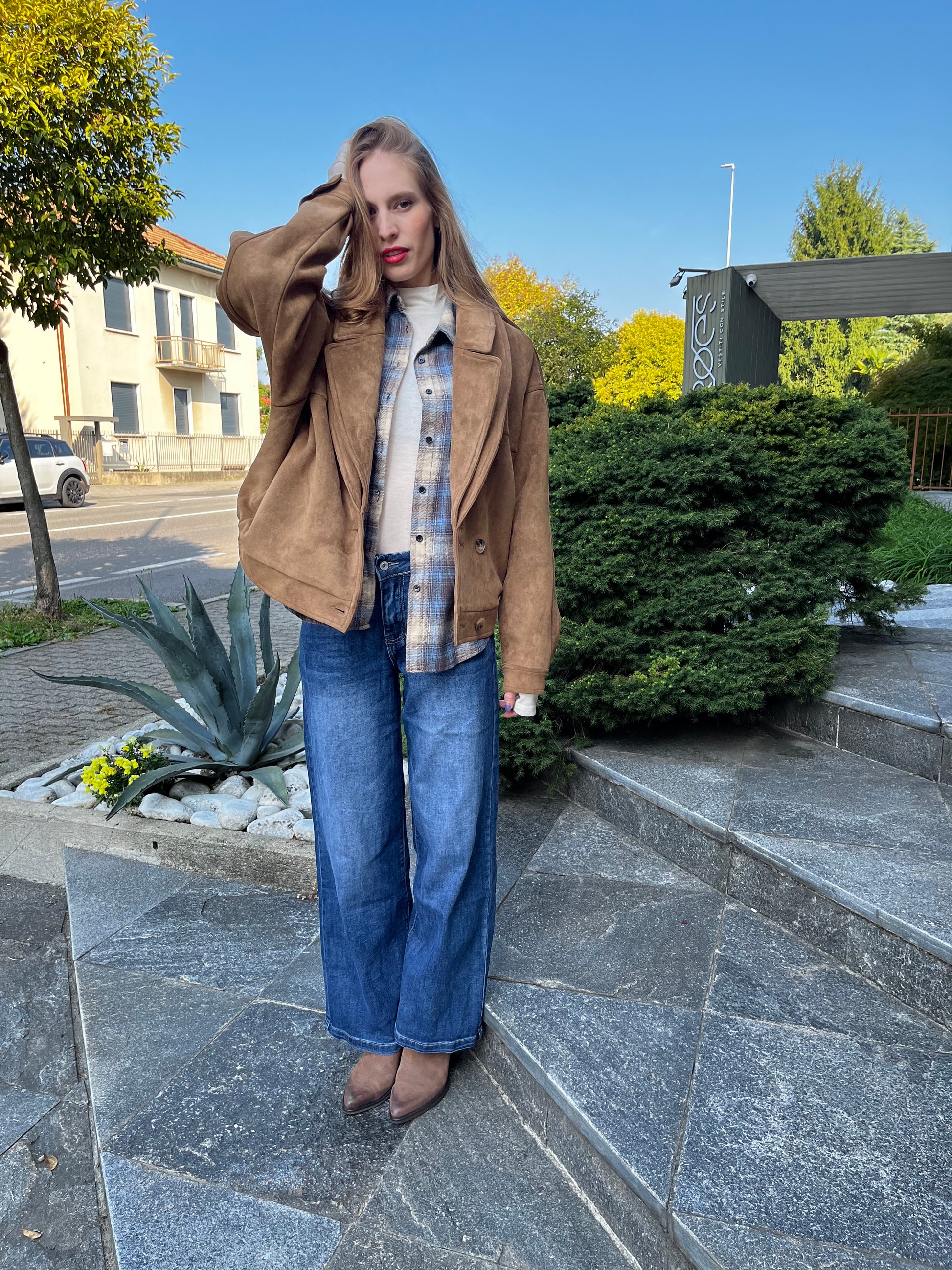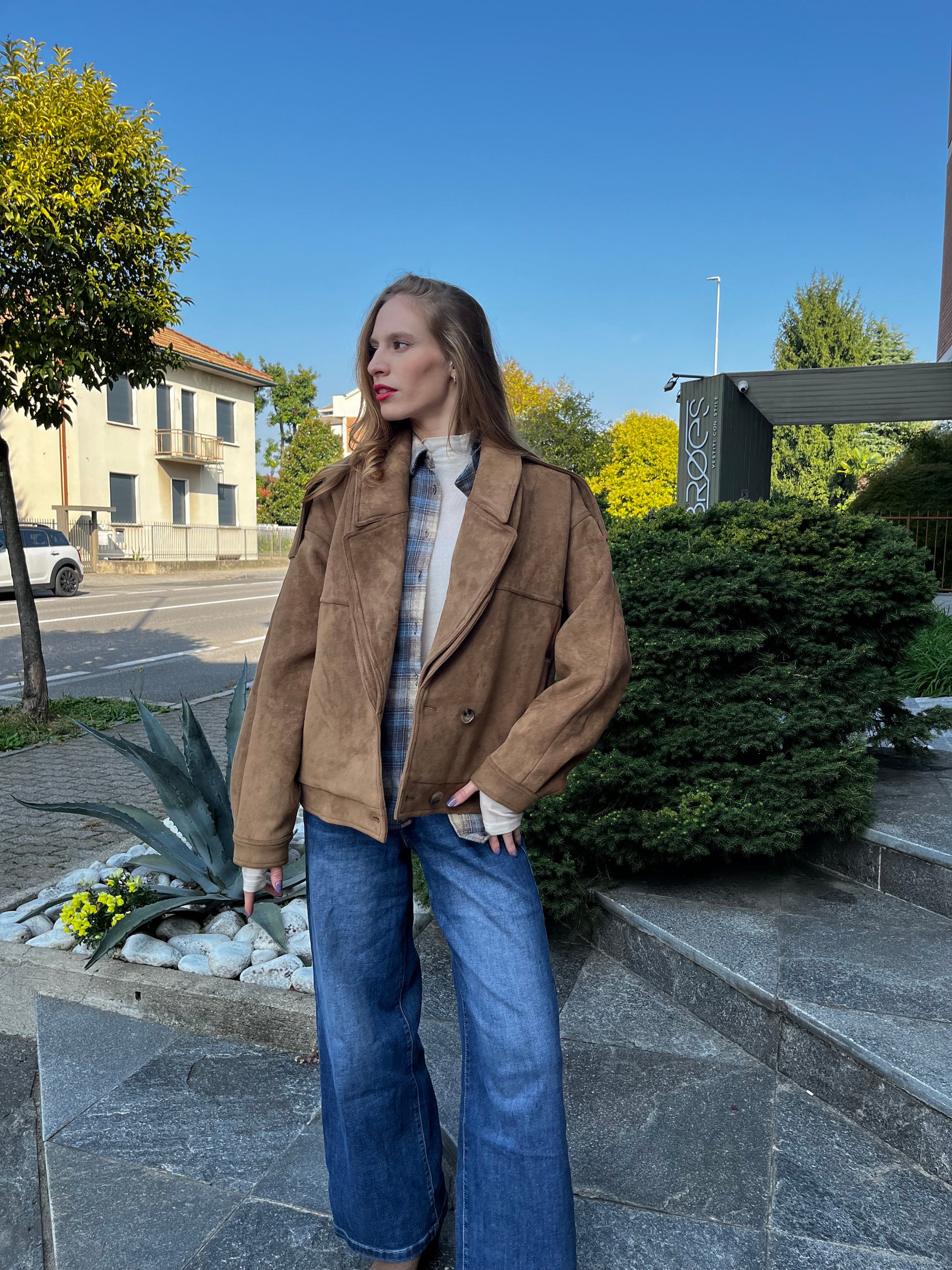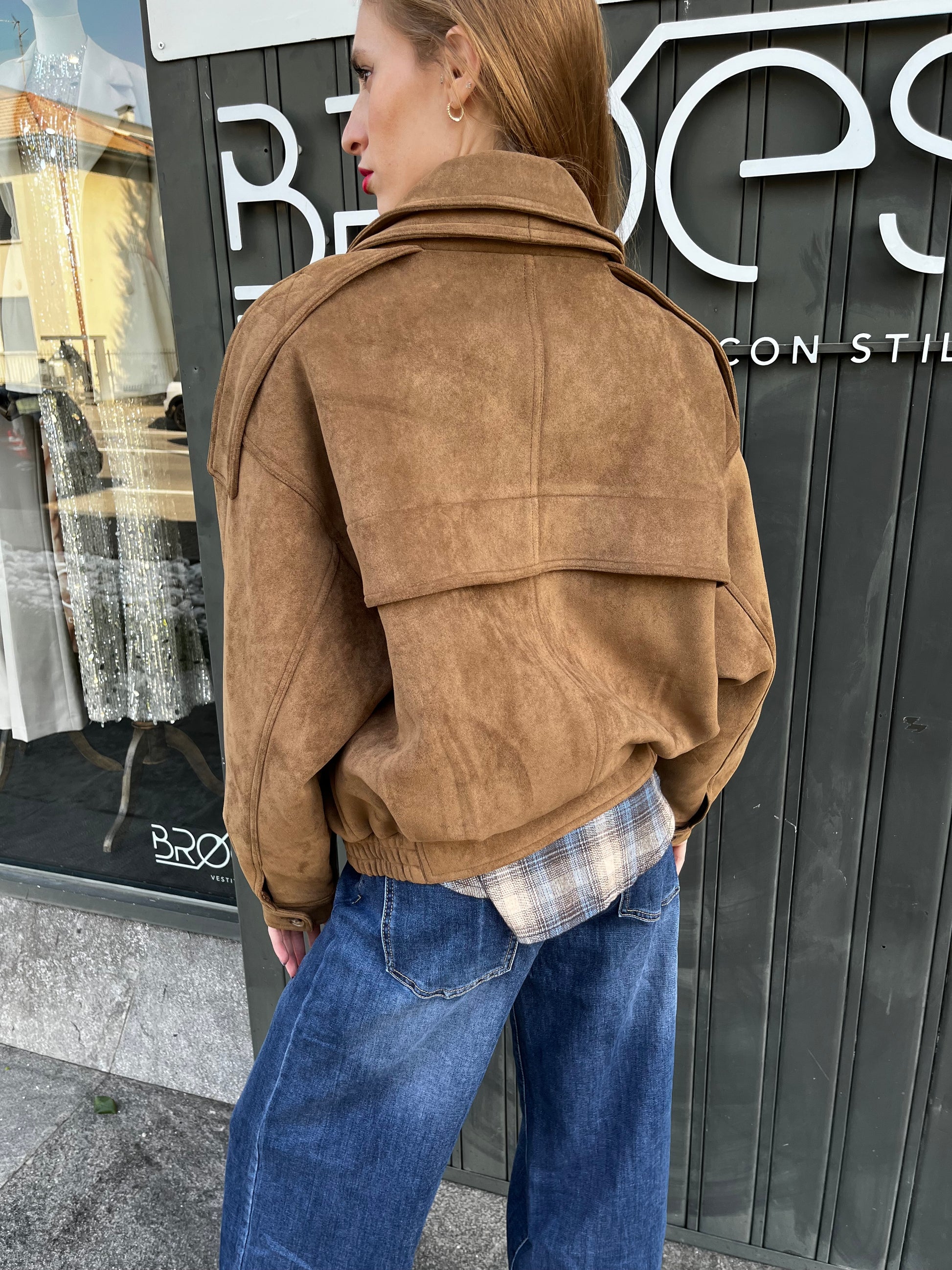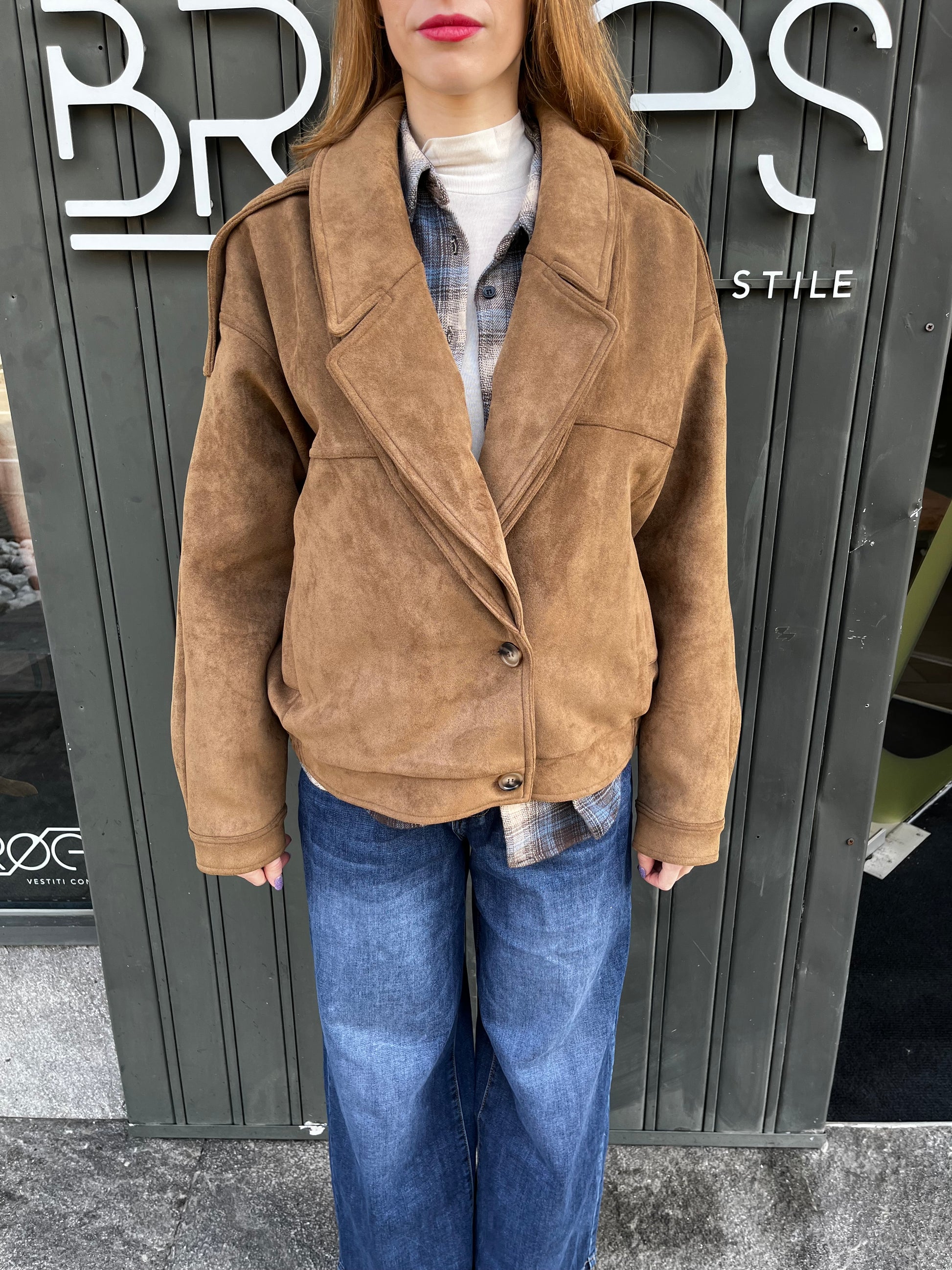 Giacca scamosciata, vestibilità comoda la modella indossa una tg 40