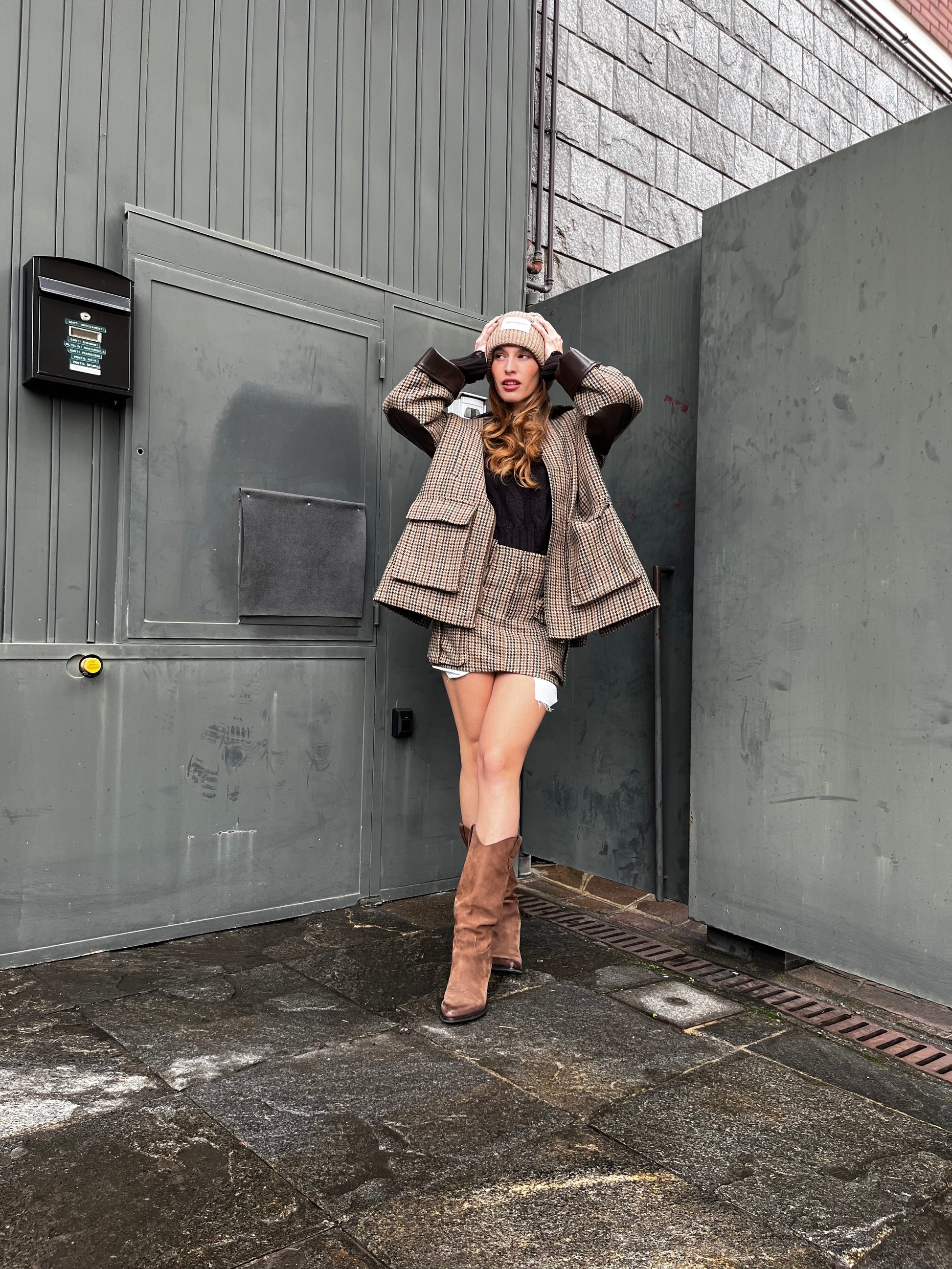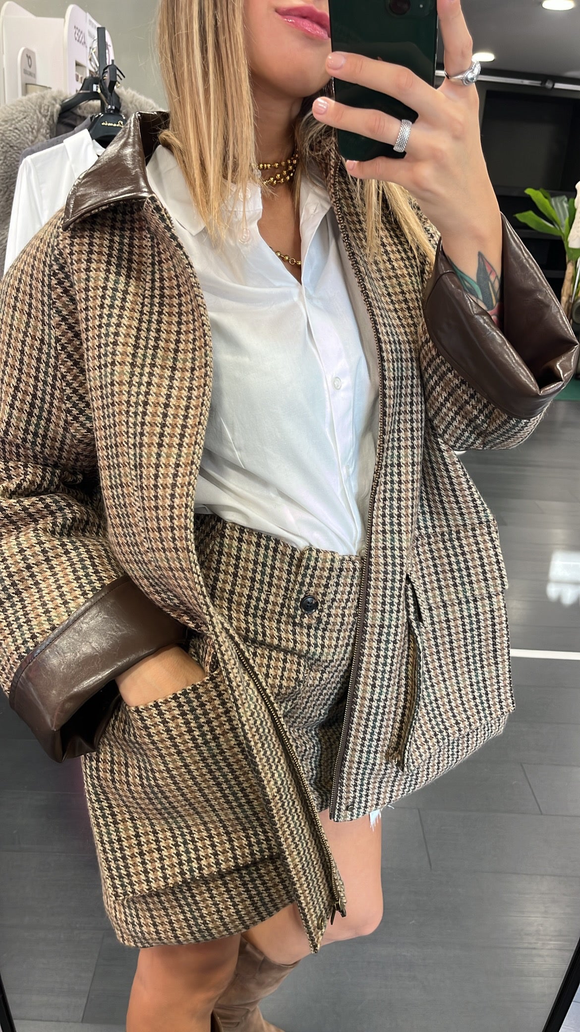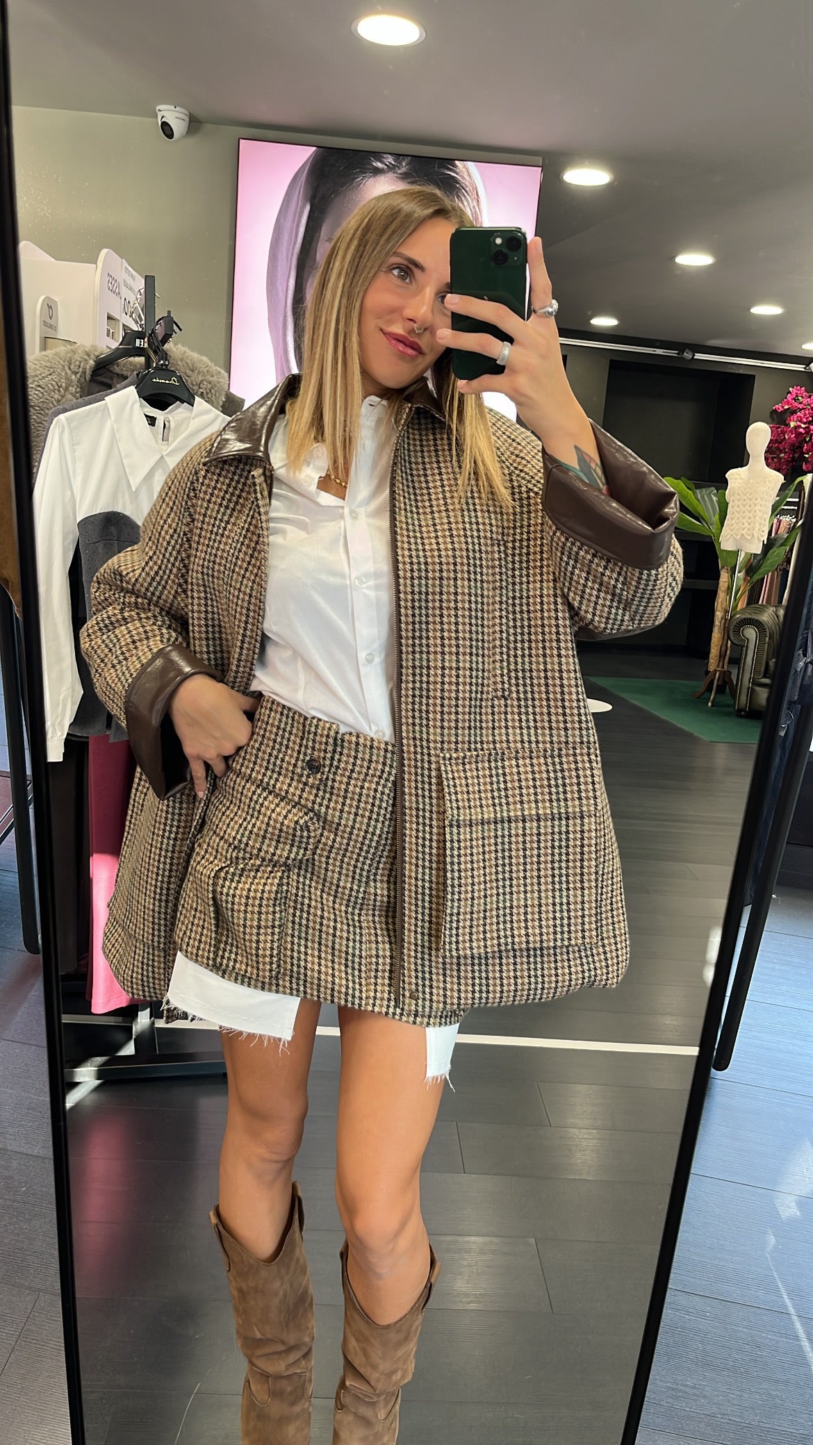 Giaccone Eleh in pied de poule con inserti in ecopelle sul colletto, polso e toppe sul gomito. Vestibilità over. La modella indossa un 40.
