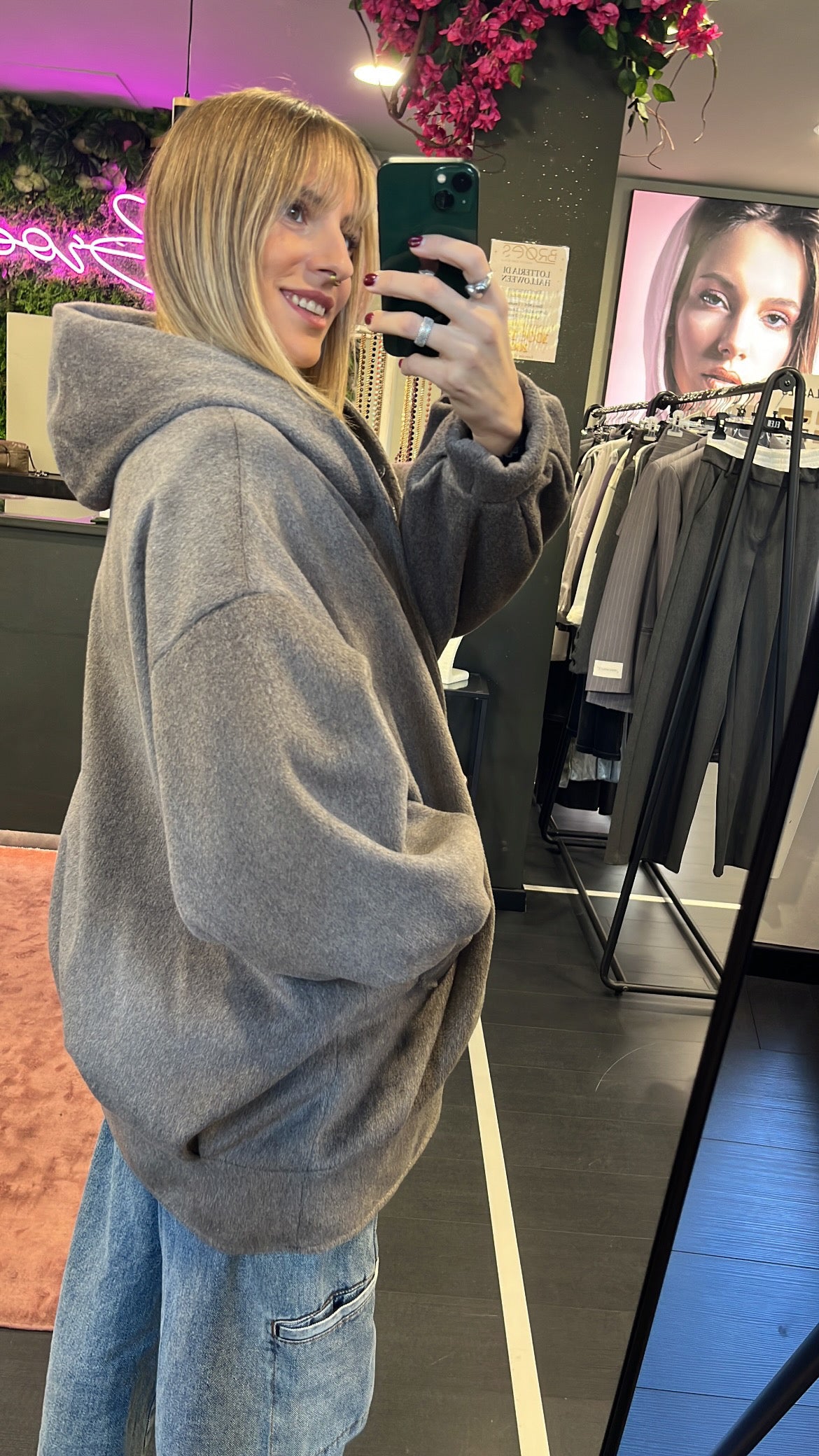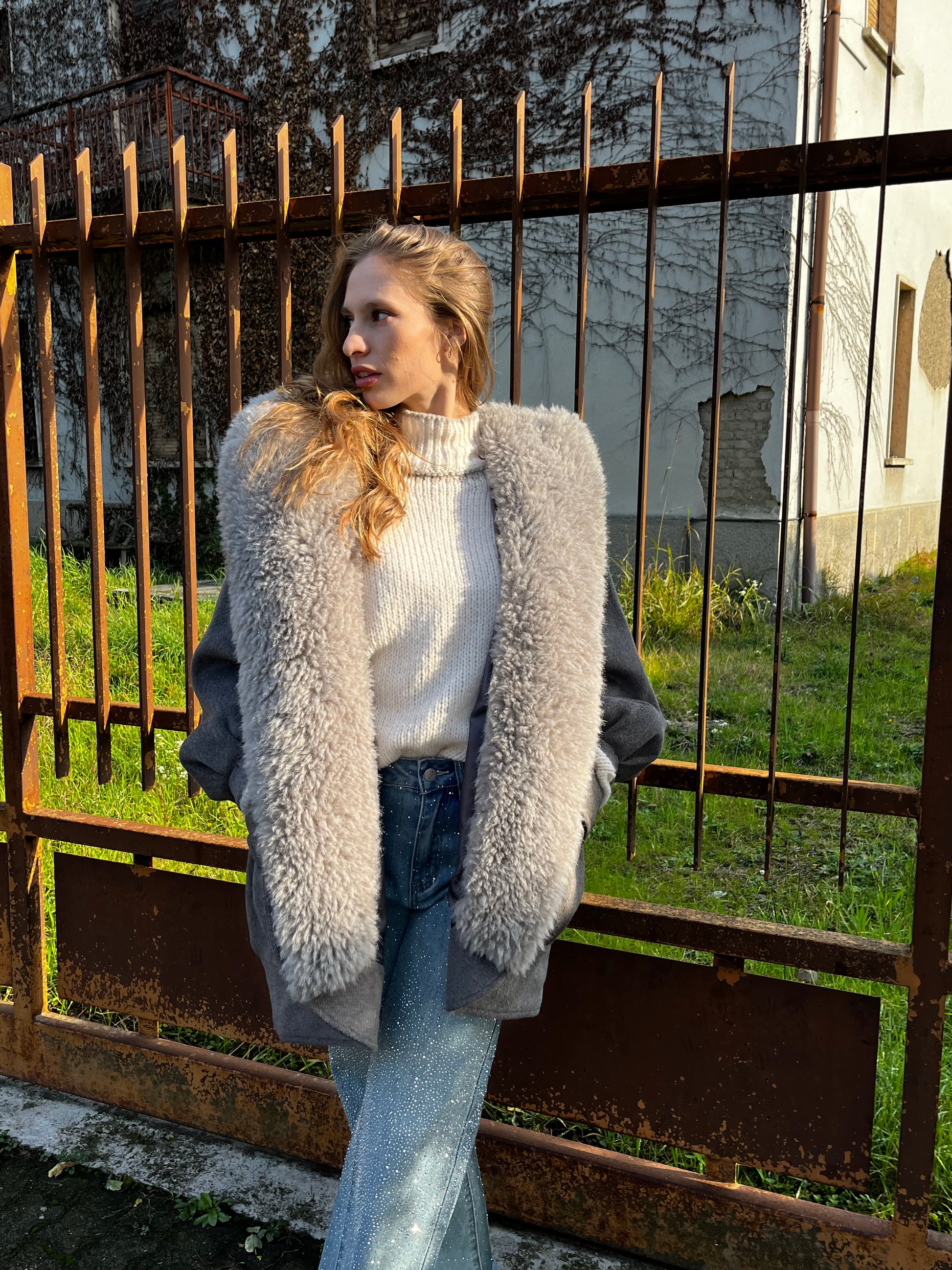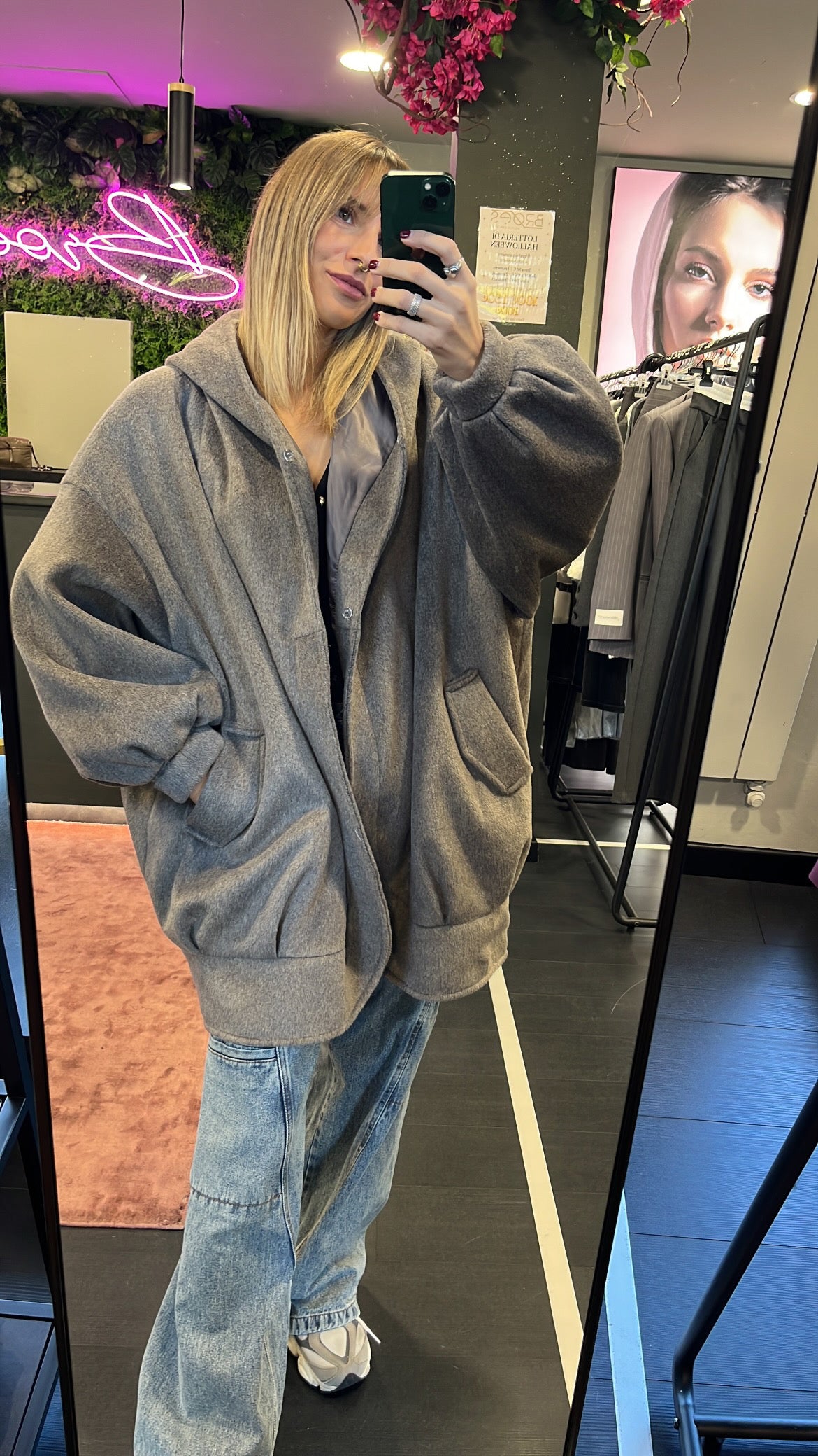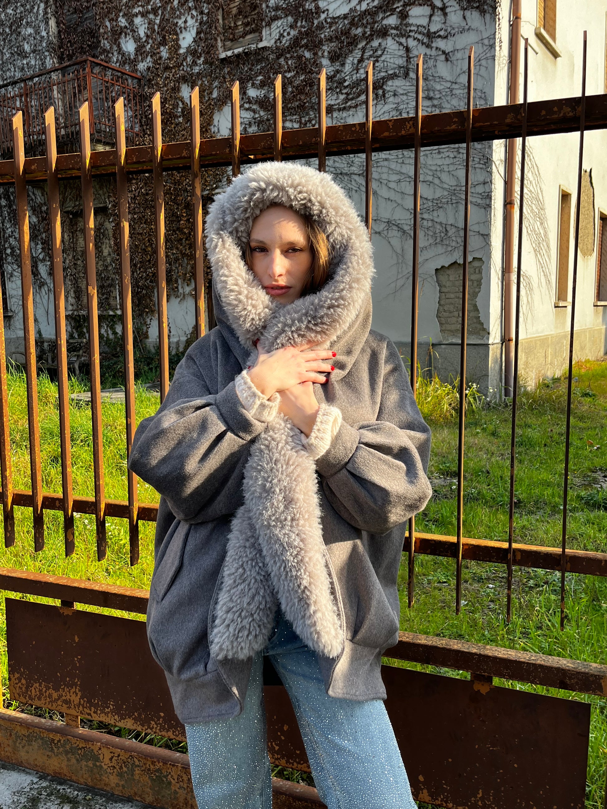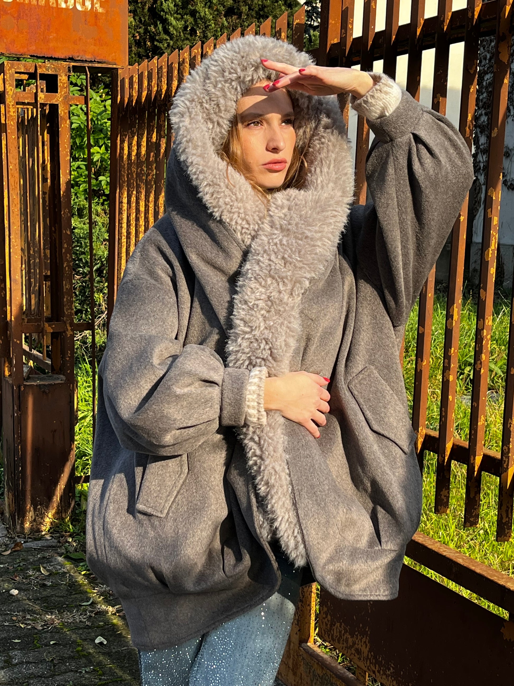 Giubbotto Eleh. Vestibilità over con tasche, cappuccio e peliccia removibile. Foderato internamente. Morbido e caldo. La modella indossa una 40.