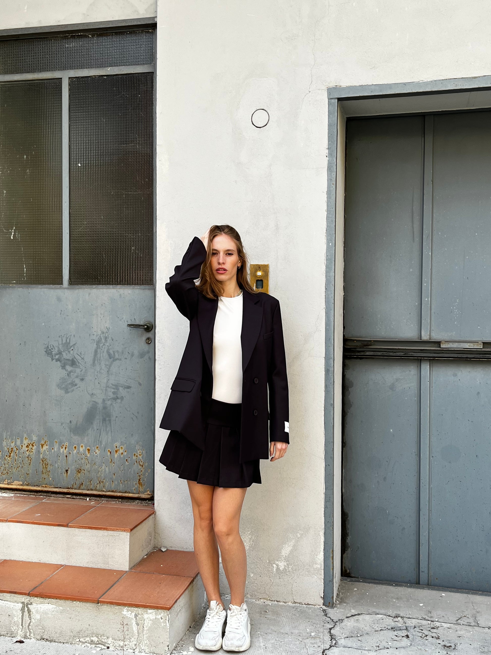 Gonna pantaloncino a vita bassa con pieghe, stile college. La modella indossa una XS.
