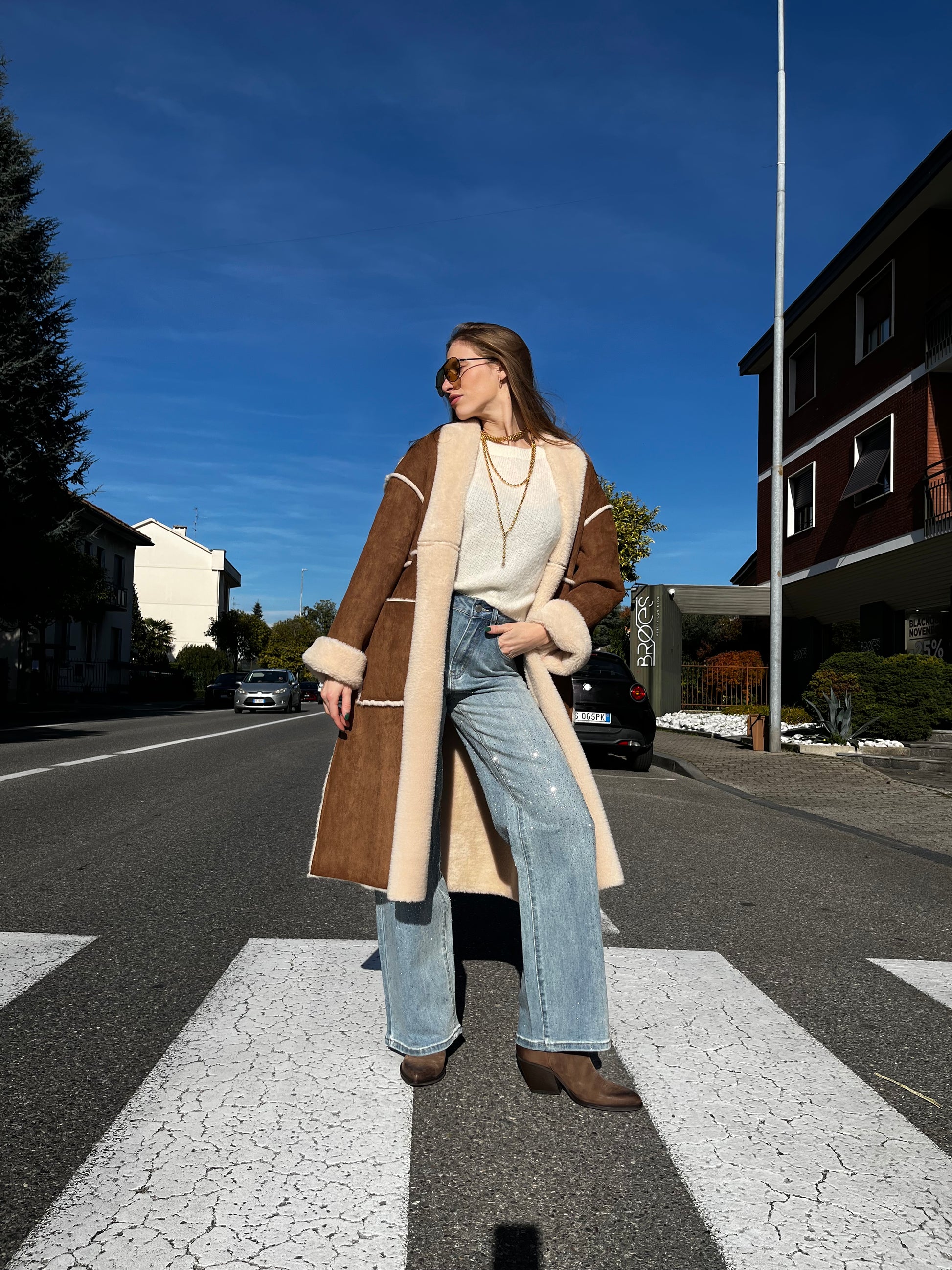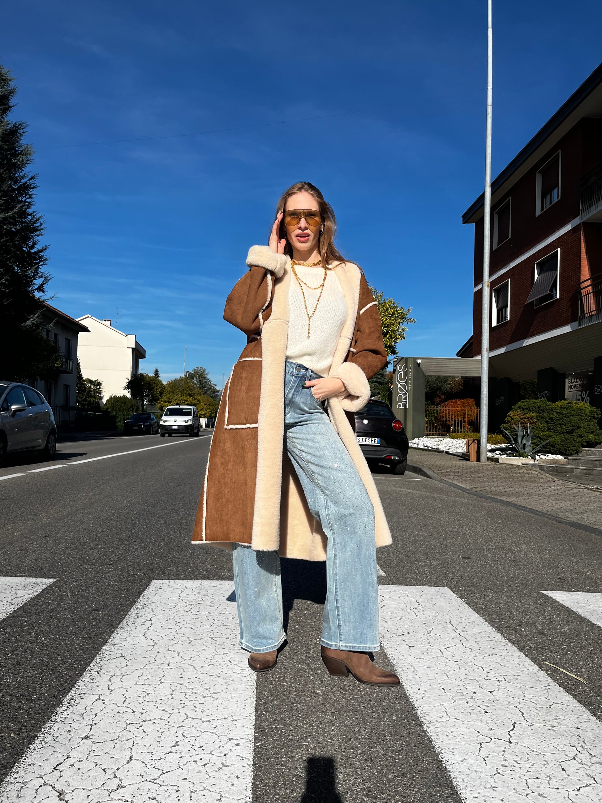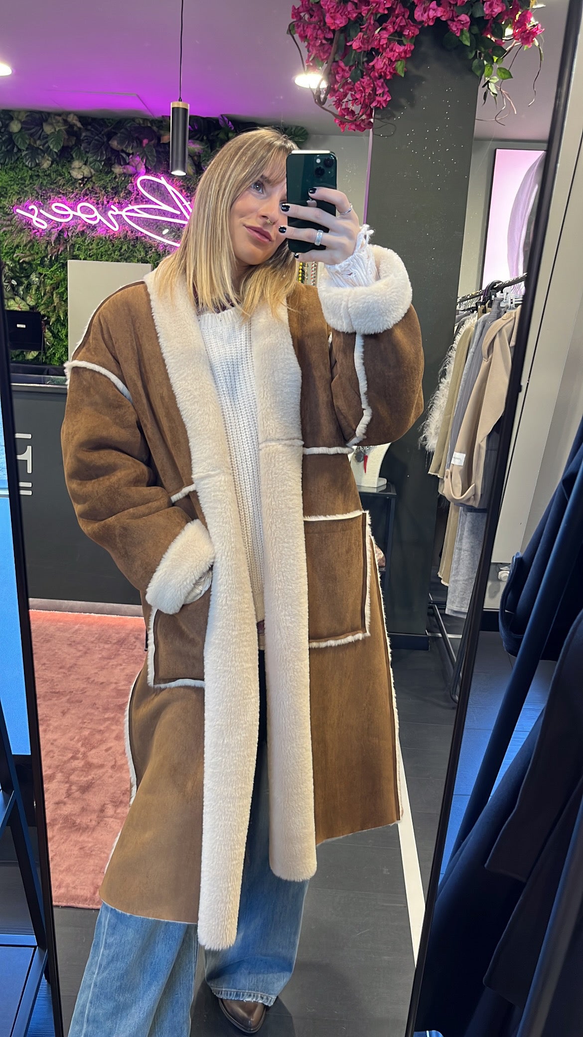 Montone lungo Eleh Vestibilità over. Scamosciato con Ecopelliccia interna morbido e caldo. La modella indossa una 38.