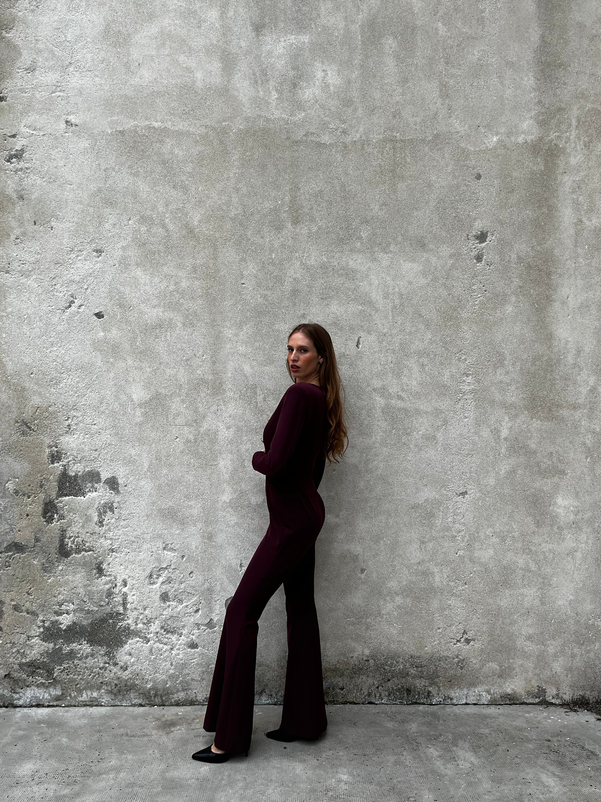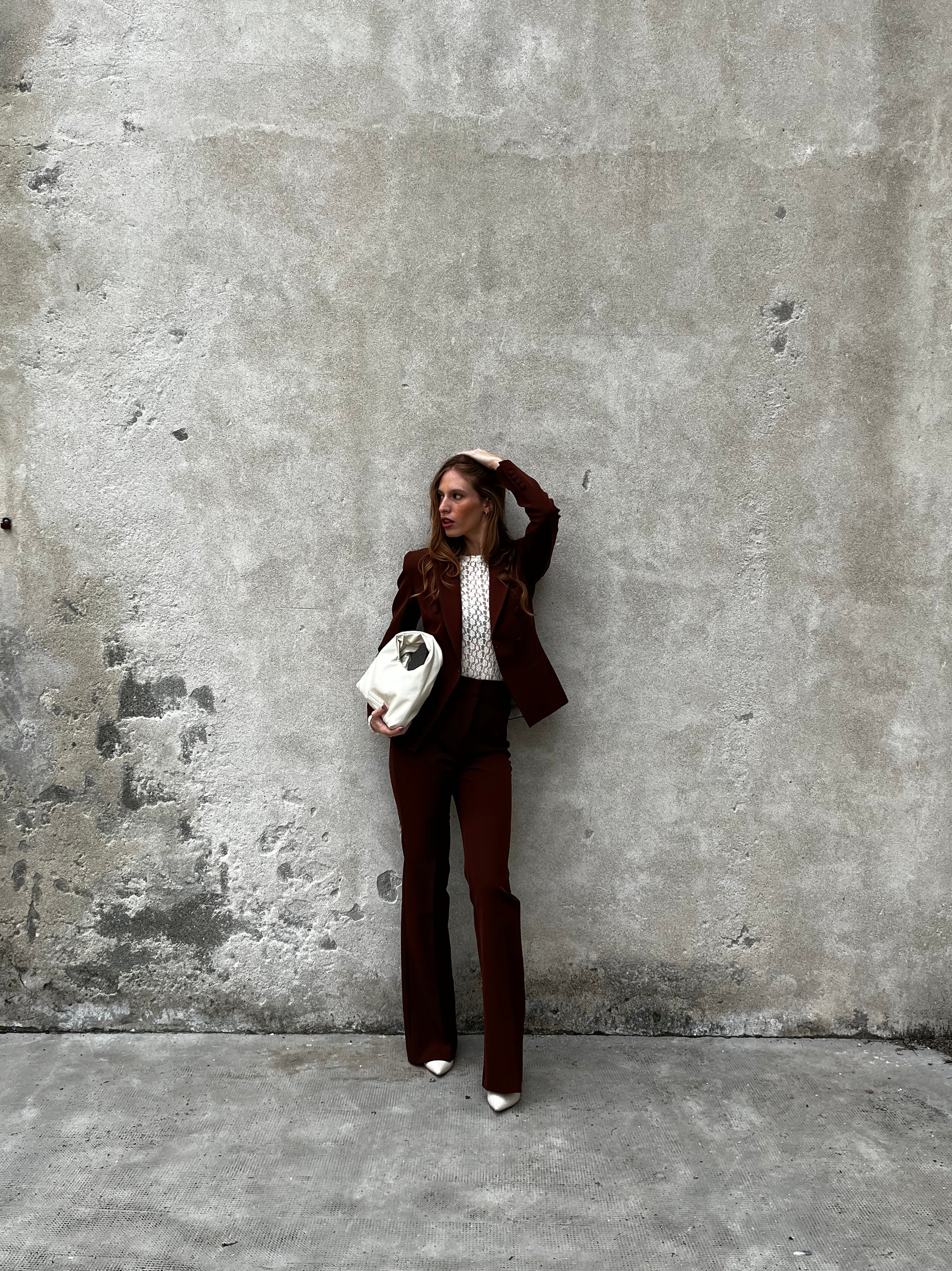 Pantalone a zampa a vita alta.la modella indossa una XS.