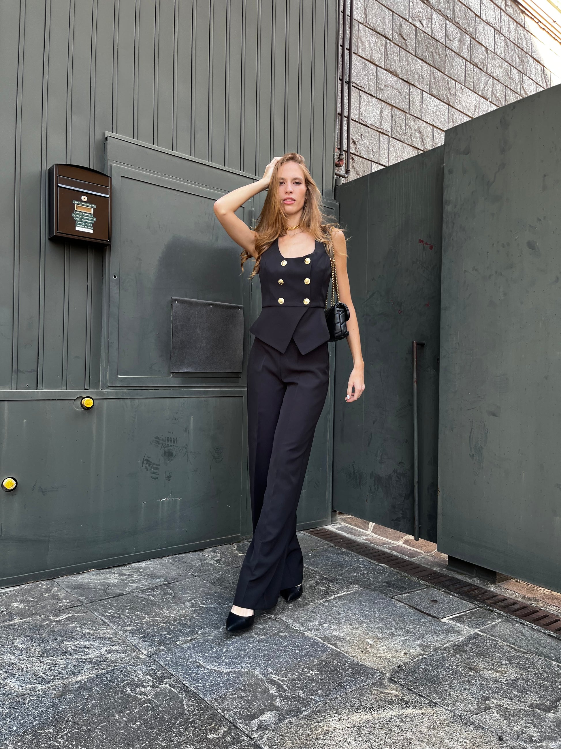 Gilet doppiopetto, smanicato, scollo rotondo, bottoni color oro loggati.