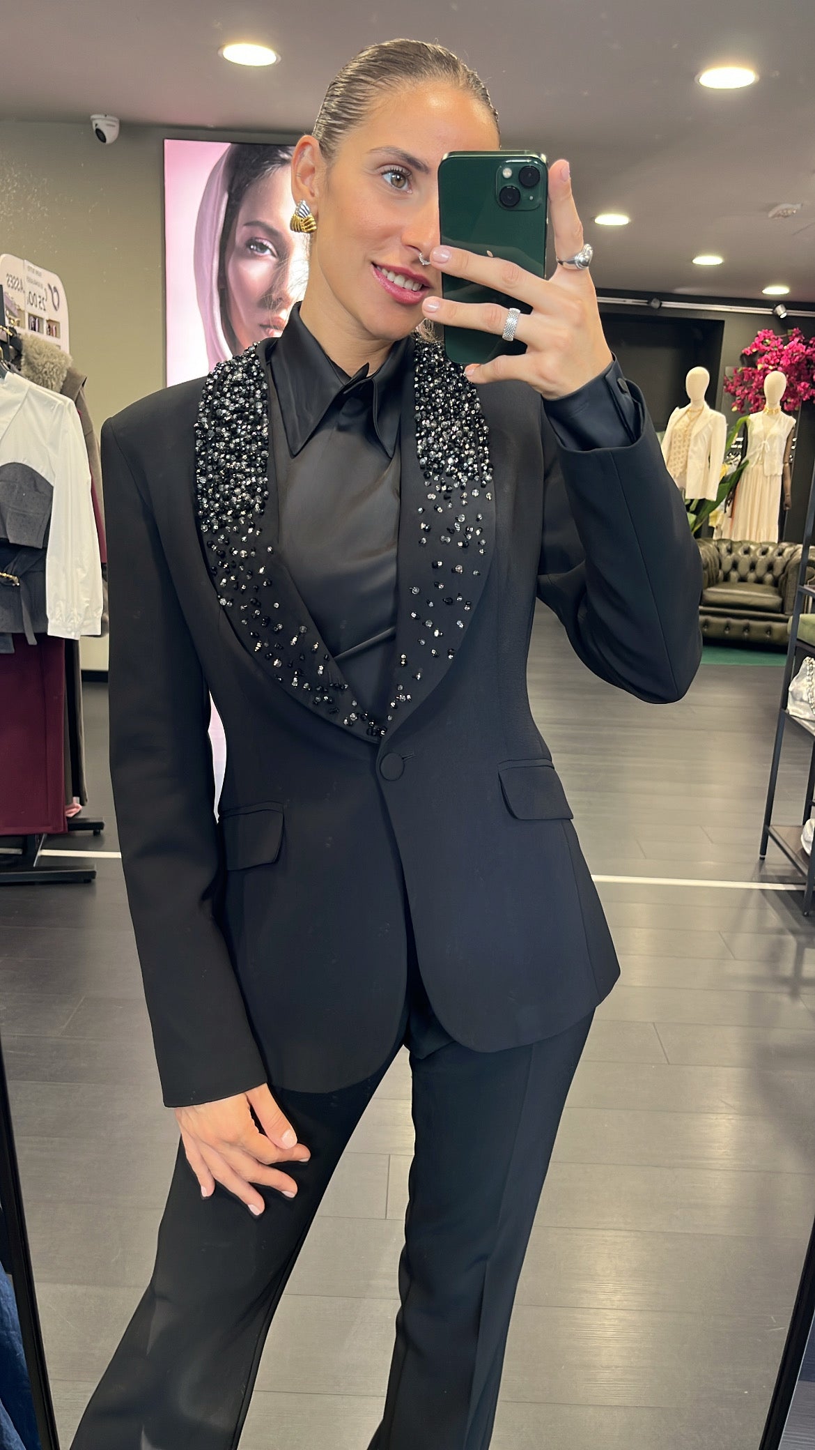 Tailleur con giacca monopetto vestibilità regolare, revers con perle nere e argento. Pantalone a zampa e vita alta, linea pulita senza tasche.